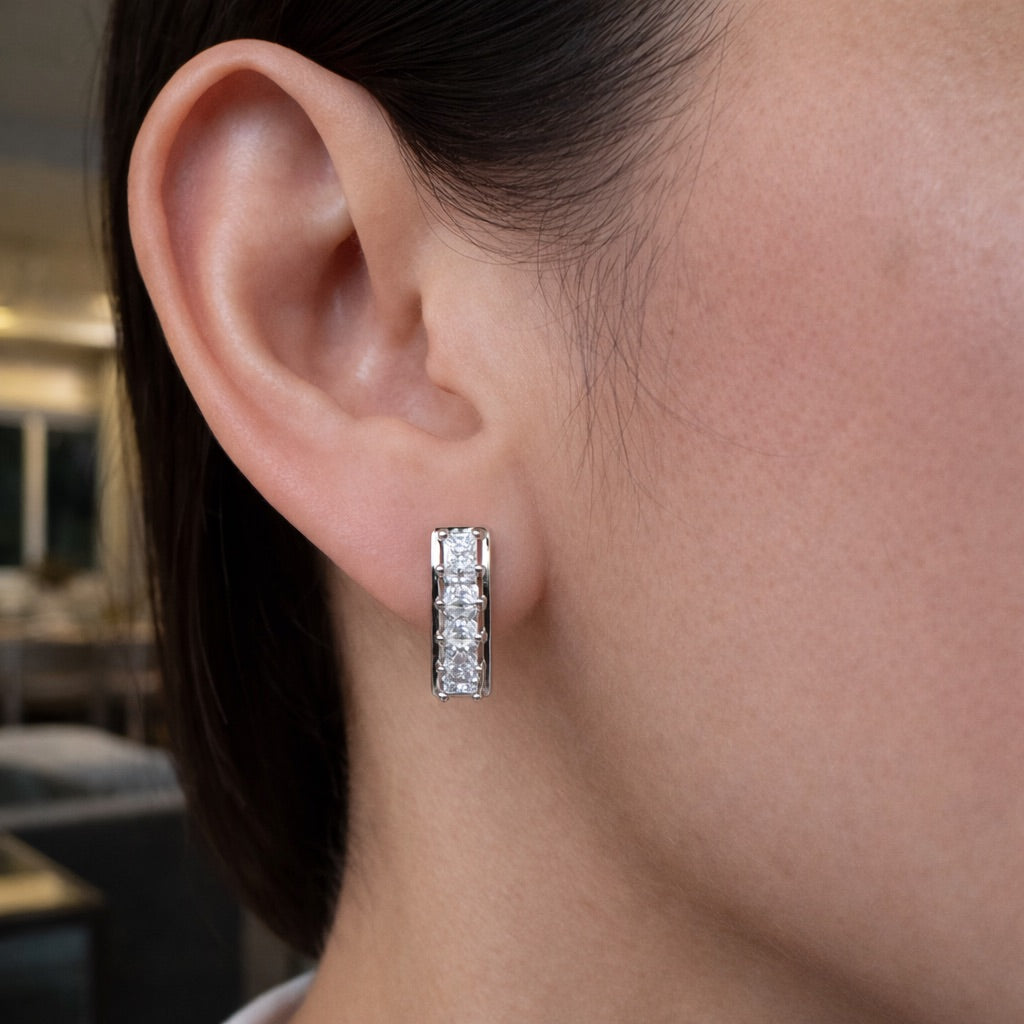 Vertical bar earrings with brilliant cut stones. Comes in yellow gold and white gold.