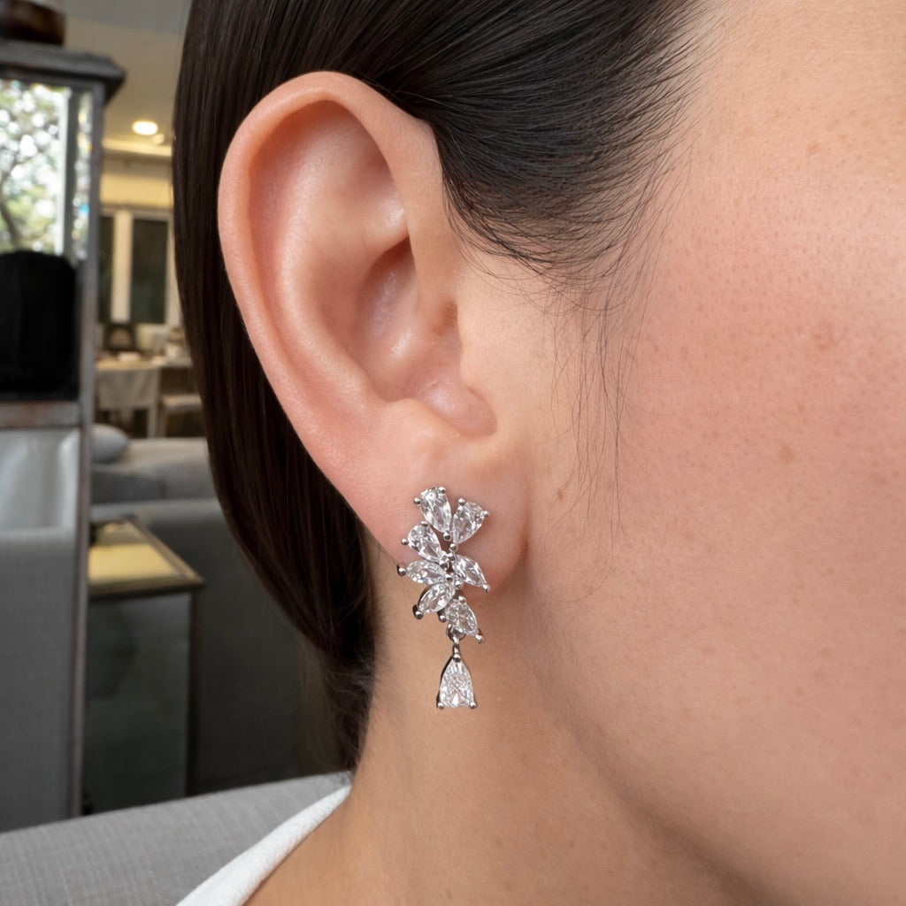 Marquise and pear cut stone floral drop earring white gold setting.
