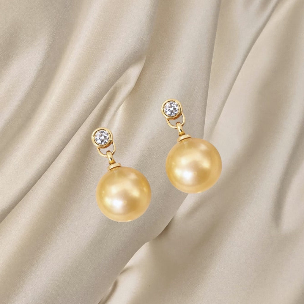 Elegant gold earrings featuring a gold pearl drop.