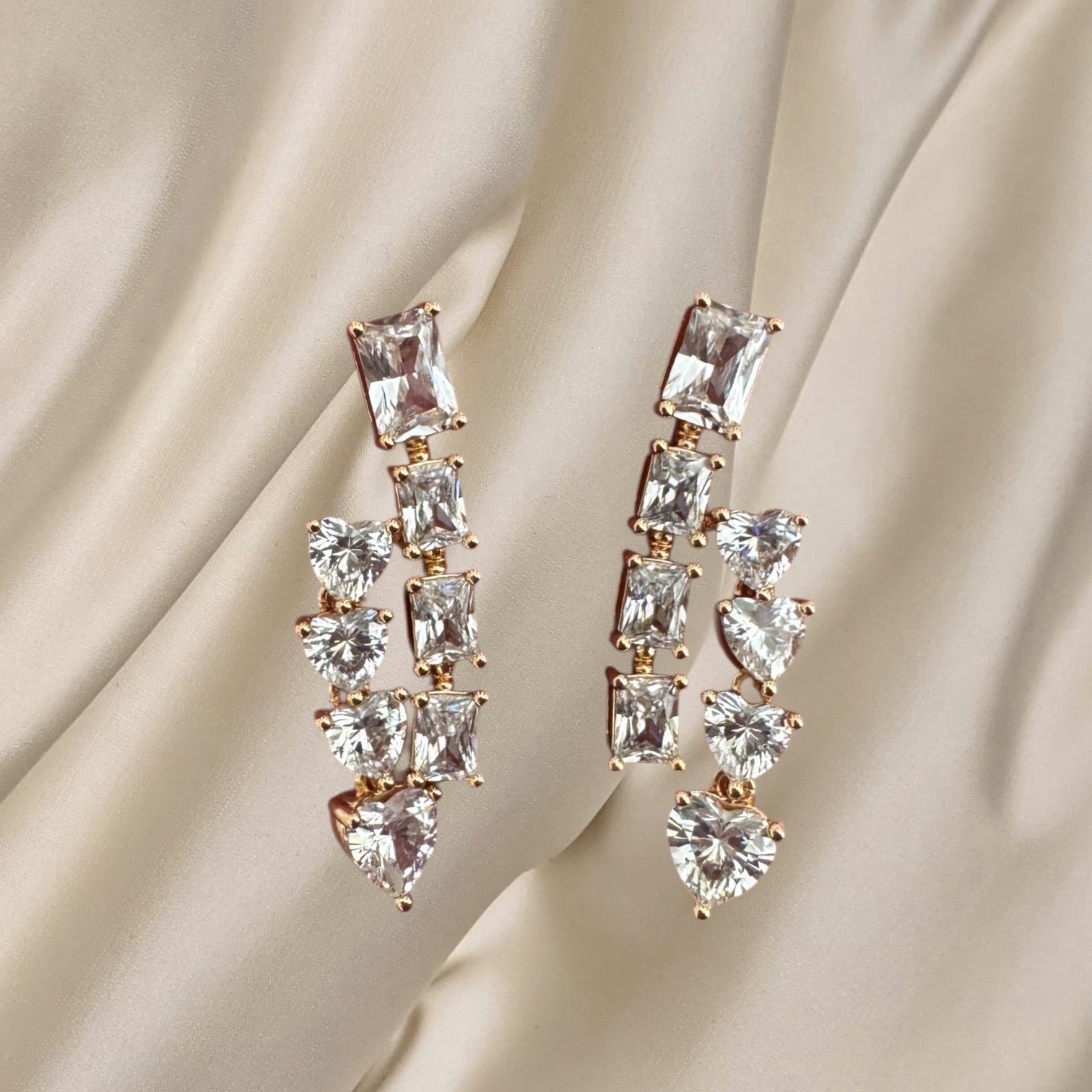 Elegant drop earring with cascading mix of radiant cut and heart shaped stones.